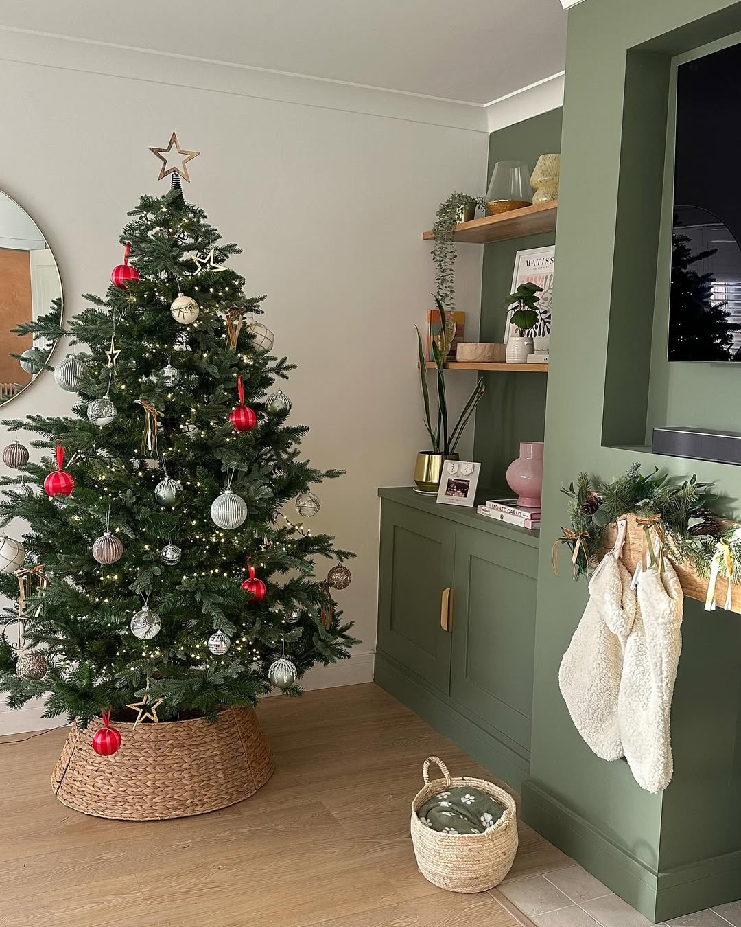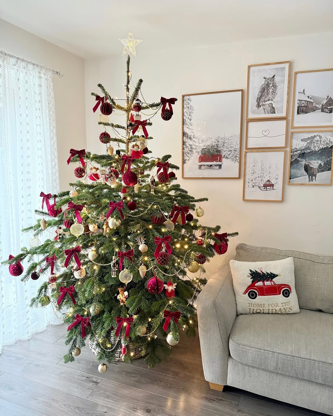 Sometimes the best christmas tree living room idea is simple. This real evergreen sits in a woven basket with a bright star and a field of velvet red bows. I started with gold bead garlands, then placed bows on tips that stick out the farthest. That spacing looks natural and balanced. For the floor, a white tree skirt or a knit throw works, just tuck the edges.