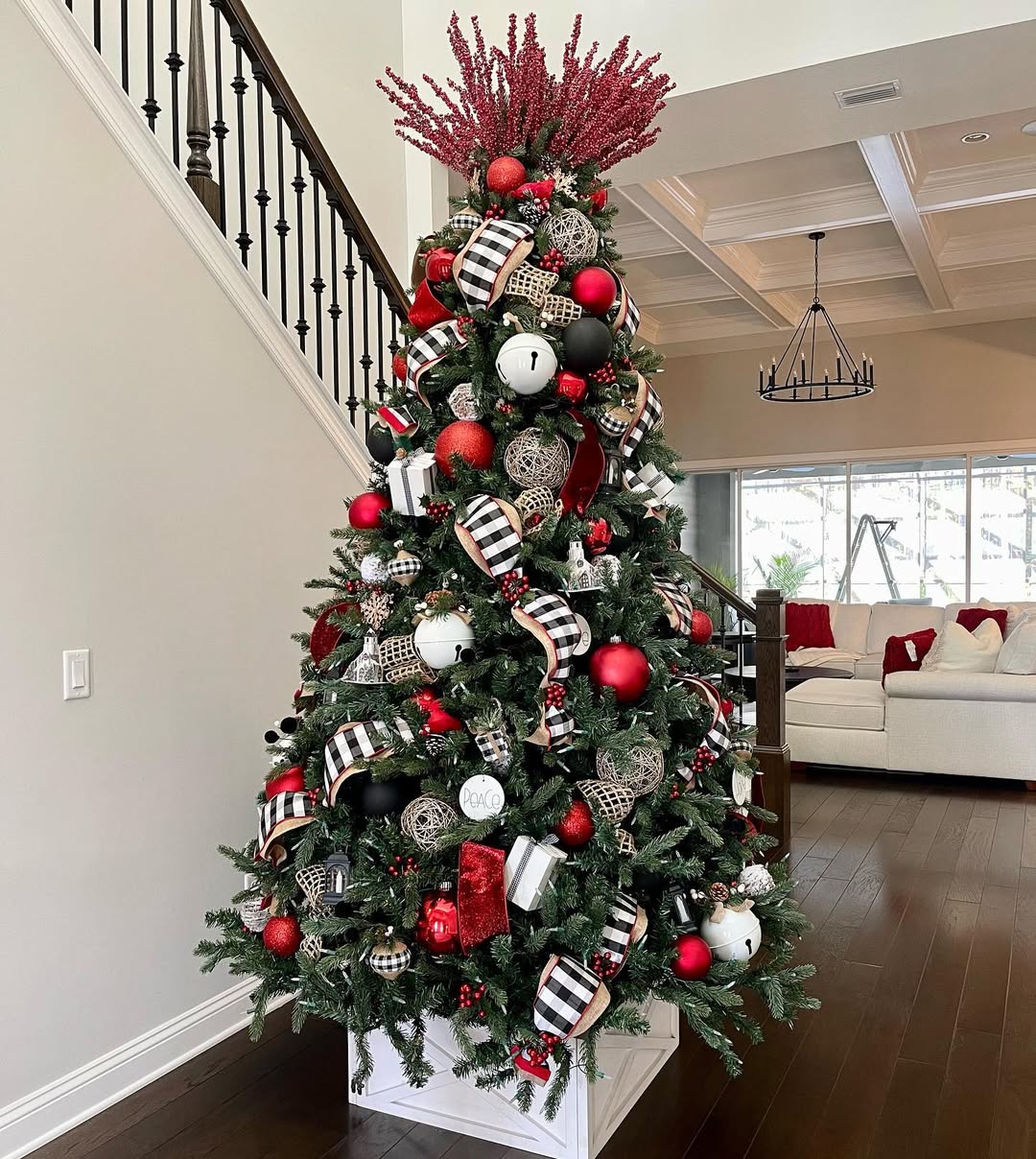 If your home is farmhouse or you just love pattern, try this. Black-and-white buffalo check ribbon spirals from top to bottom, with matte red balls and mega jingle bells tucked in. I mounted the tree on a white planter box to lift the profile. It sharpens the silhouette and keeps pets from batting the lowest ornaments. The christmas tree living room vibe is cheerful and bold.
