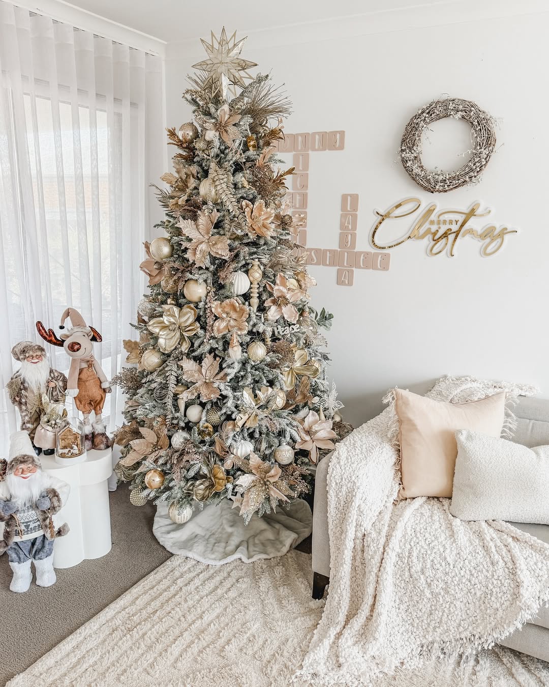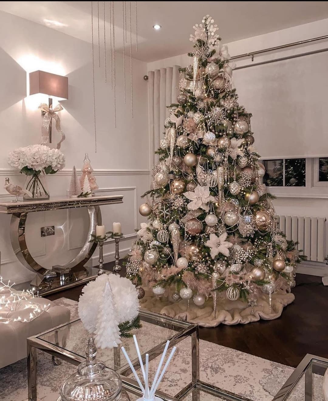 Soft blush ornaments, pearls, and layered snowflakes create a wintery glow that’s fancy but friendly. Start with two garlands, one beaded and one pearl, and stack them. Hang snowflakes in three sizes, largest near the bottom. Add a faux fur tree skirt so everything lands on a cloud. A mirrored console and glass coffee table reflect the tree and make your christmas tree living room sparkle twice.
