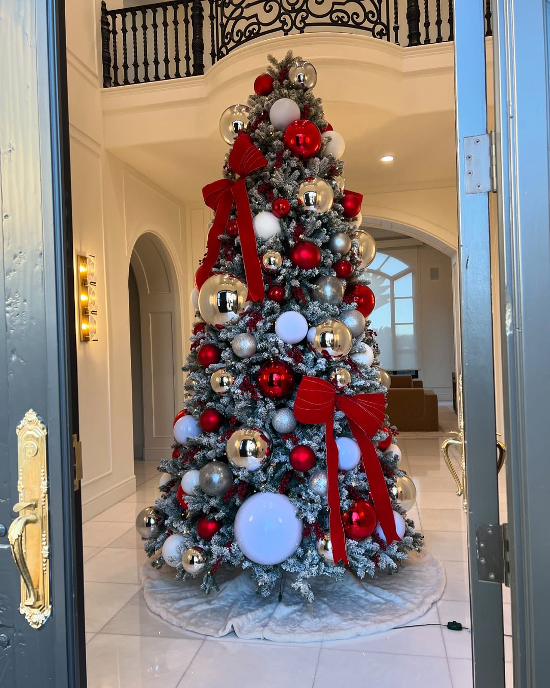 Even if you don’t have a two-story entry, you can steal the idea. Use fewer, larger ornaments. I used 8 to 10 giant spheres in red and silver, then filled gaps with medium white balls. The scale tricks the eye and the living room Christmas tree reads sophisticated. A big satin bow topper anchors everything and gives a finish line for the ribbon tails.