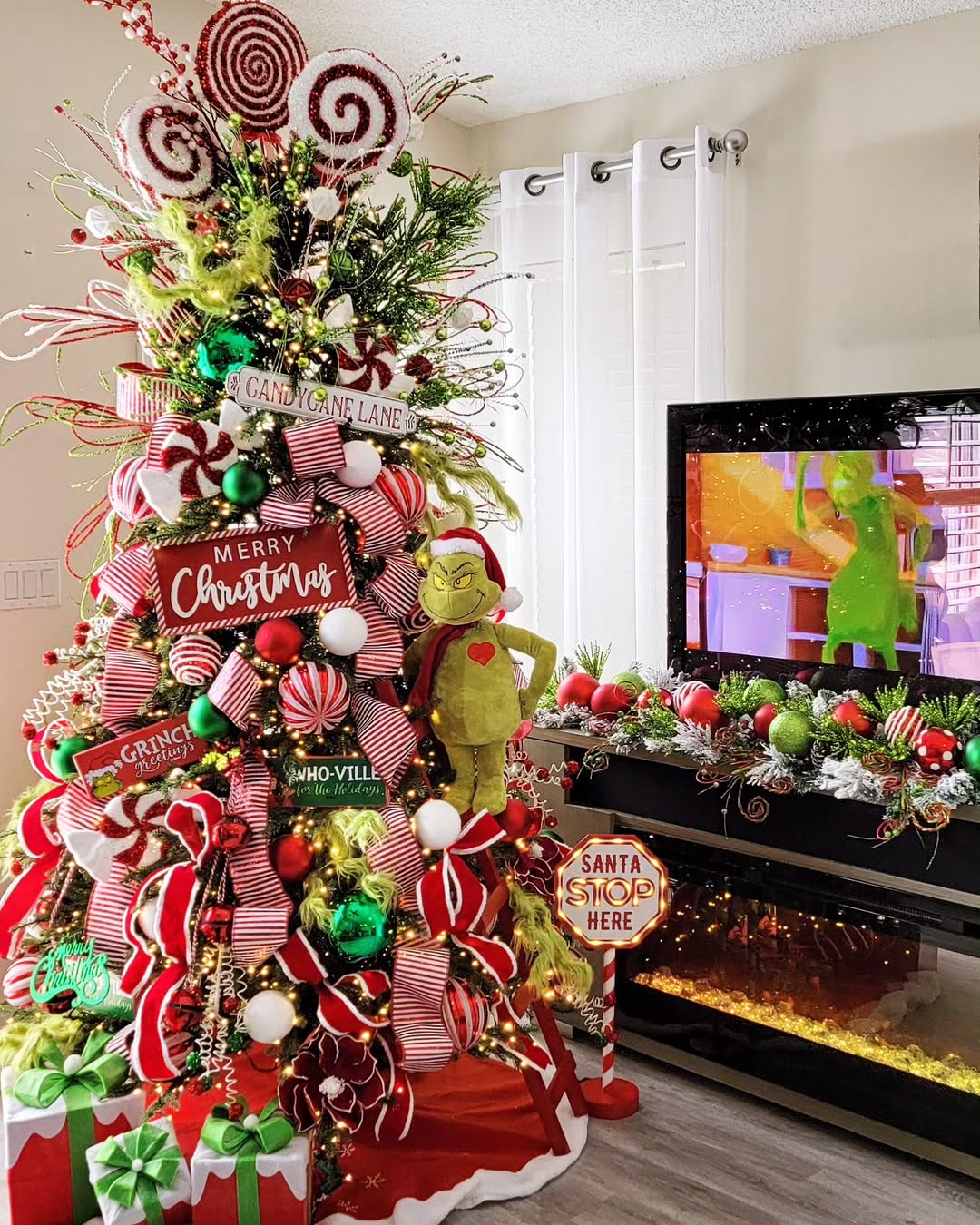 To steal the look for your christmas tree living room setup, limit the green to Grinch-lime pops and keep everything else red, white, and slightly sparkly. Use large foam candies to fill holes so you don’t need a thousand tiny ornaments. If you decorate with kids, pre-tie ribbon loops and let them “hang” the candy signs with velcro ties. It’s chaos-proof and honestly more fun.