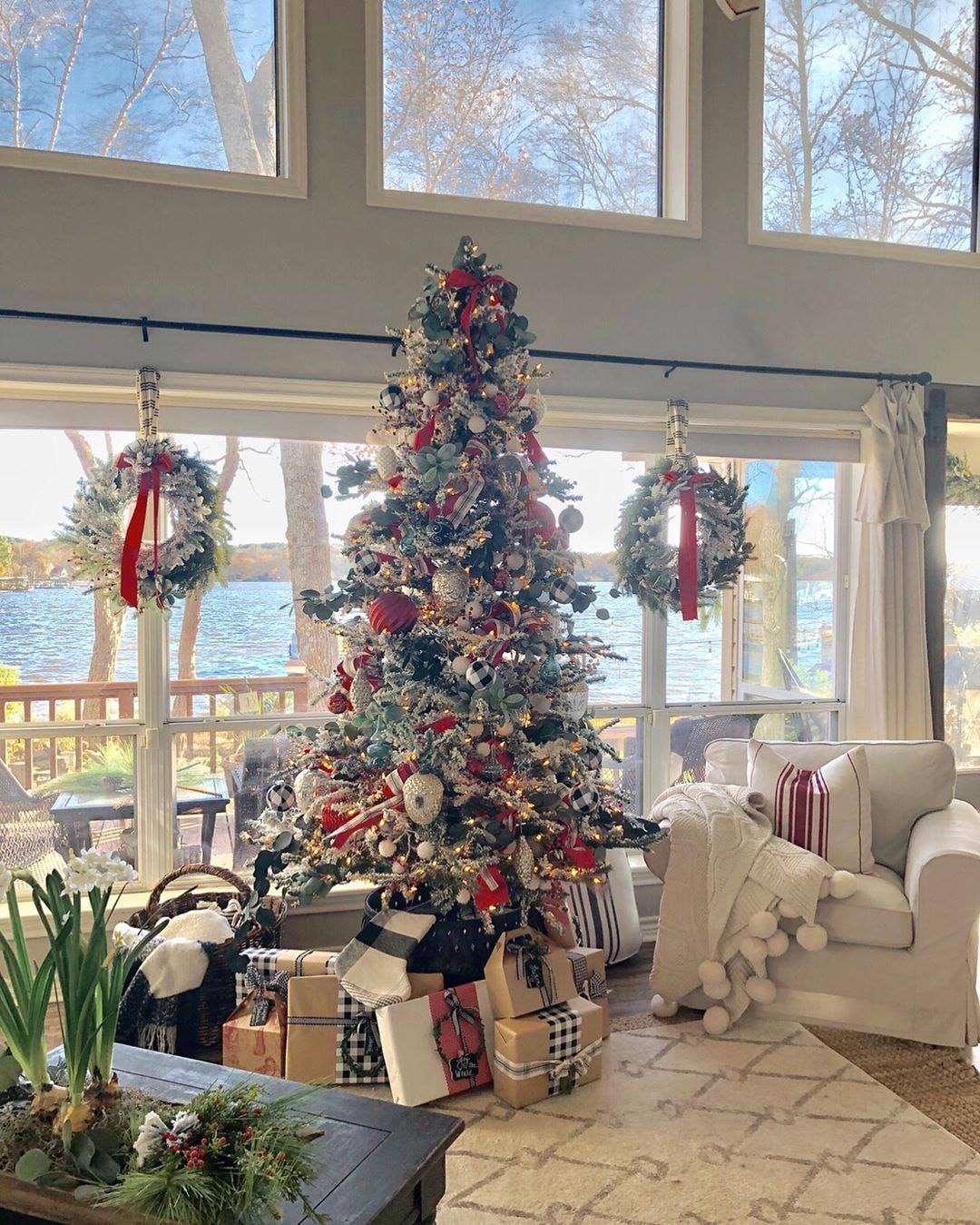 Here the tree sits near big windows with water views. The mix of red ribbons, black-and-white check, silver baubles, and seeded eucalyptus stems feels fresh and classic at once. I’m into how the wreaths in the windows echo the tree shape. Smart and simple. Put your tallest ornaments high and your darker plaid ribbon low to ground the shape.