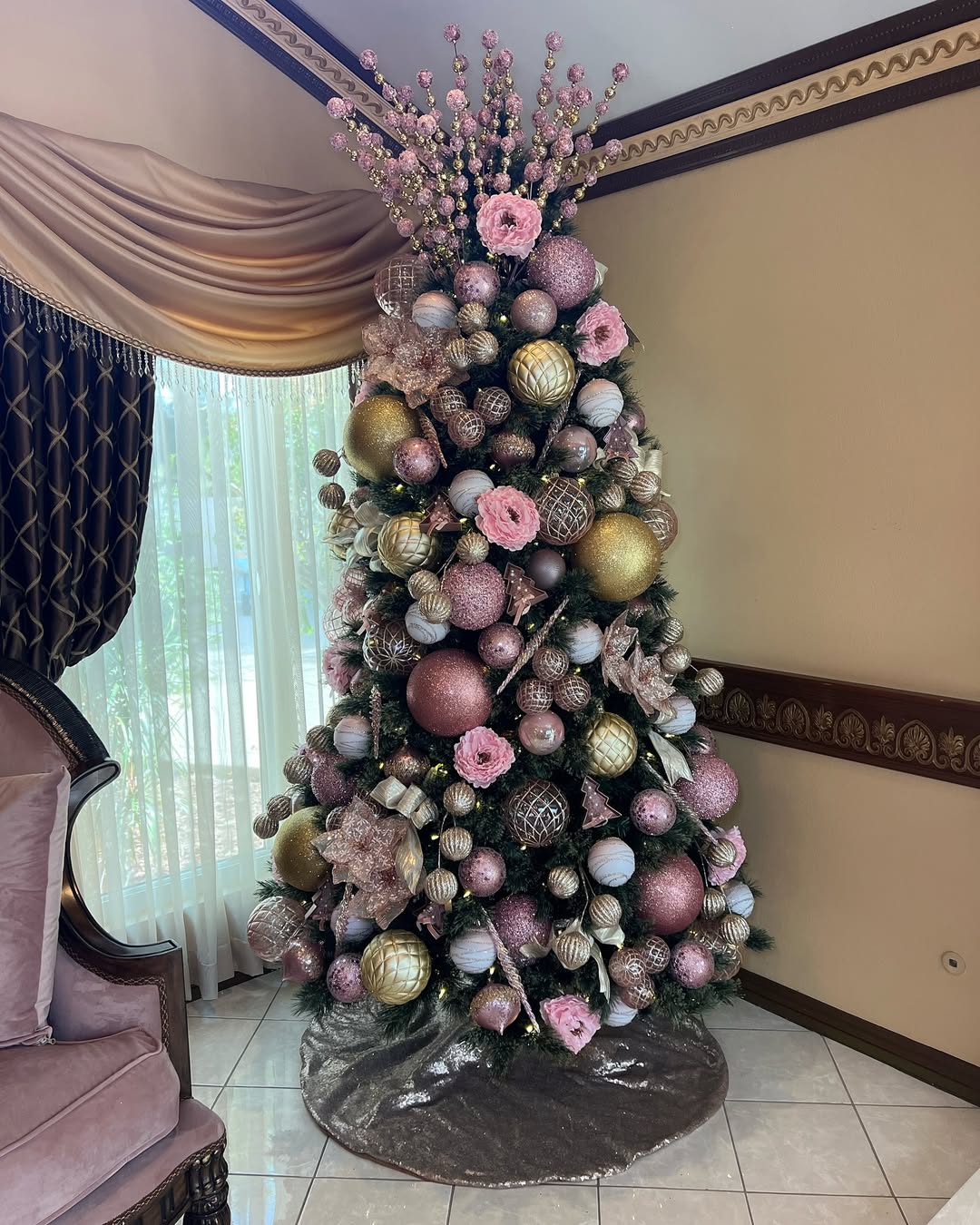 Practical stuff I learned: keep the lights warm white and push them deep into the branches first, then layer sparkle on top. Use a shimmery tree skirt or a champagne tree collar to echo the drapery if your lounge has formal curtains. If your walls are beige or cream, this palette warms everything up. For a family room Christmas tree that still feels grown up, limit the bright red and lean on rose gold. Bonus hack: tuck a few smaller ornaments close to the trunk to give real depth. It’s like contour for your holiday tree in the living room.