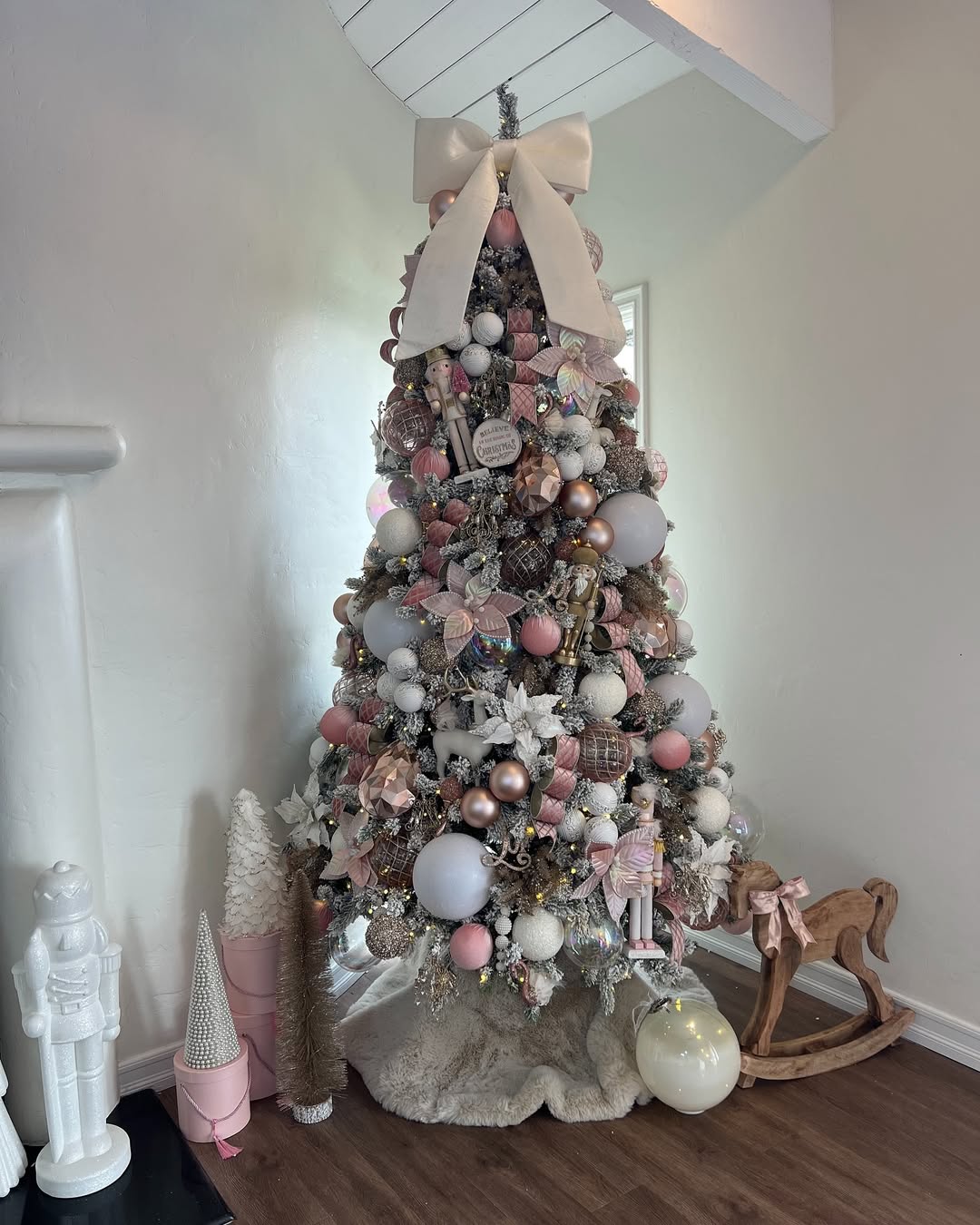 This one looks like a fairy tale, and honestly, I’m a sucker for that giant white bow topper. The base is a lightly flocked tree with ornaments in pearl, blush, and frosted silver. Iridescent balls bounce light like crazy. Add soft ribbons in crisscross “S” curves and tie a few mini bows on the ends of branches. The result is gentle and dreamy, perfect for a sitting room Christmas tree where you cozy up with cocoa. I placed a wood rocking horse nearby and it made the whole living room tree scene feel nostalgic.