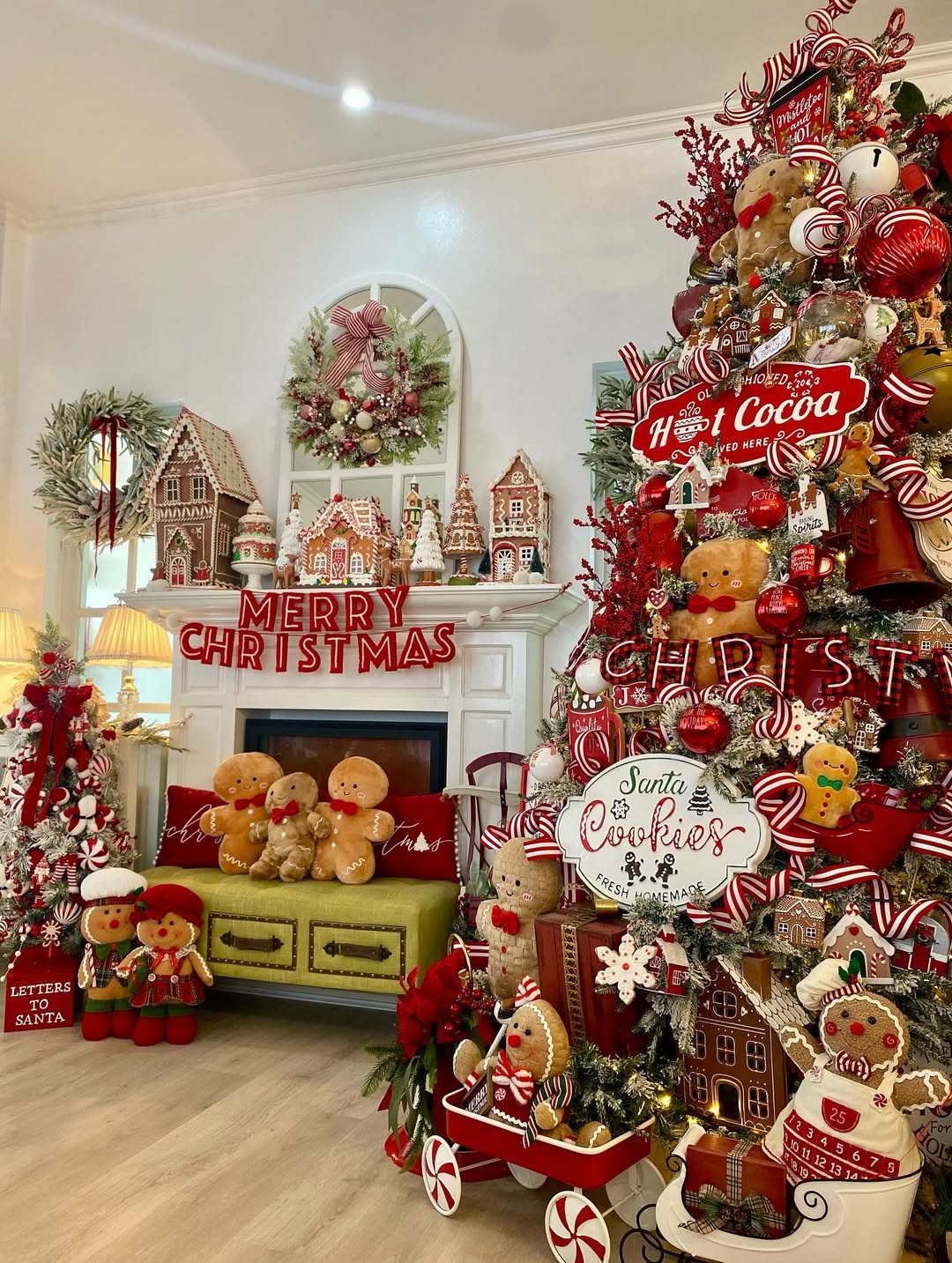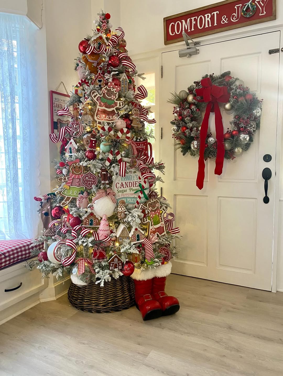 This one is all cinnamon hearts and cocoa signs. Gingerbread characters, red-and-white stripes, candy canes, and little houses everywhere. It sits by a staircase where guests enter, which makes smart sense. You get a punch of holiday joy the second you walk in. The small wagon at the base is the cutest idea. It hides cords and holds extra ornaments.