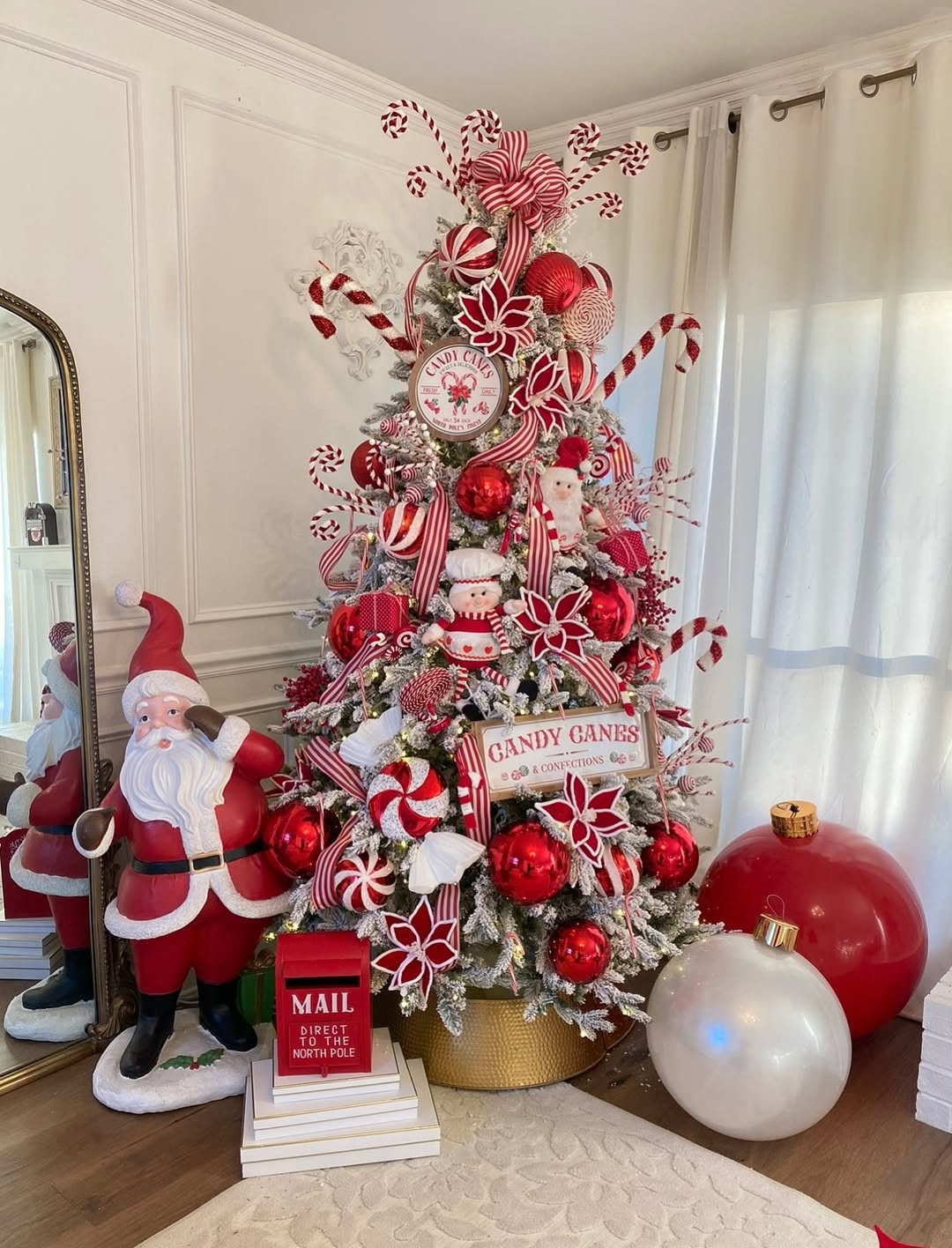 Repeat the candy energy twice. A Santa figure by the mirror and a mailbox by the base is more than enough. I also like velvet ribbon tails hanging a foot or two to guide the eye. Your christmas tree living room will feel cheerful, and the kids will guard the candy ornaments like treasure. For a living room Christmas tree idea with less red, swap half the ornaments for clear glass and it still looks sweet.