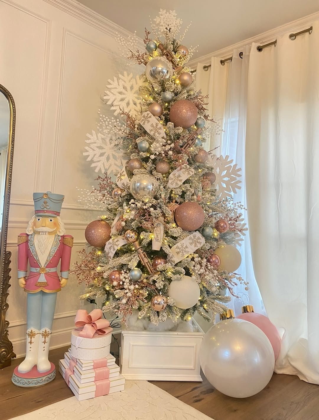 If you’re craving calm, this pastel tree whispers winter magic. Mix blush pink balls, champagne ribbons, white berry picks, and oversized snowflakes. Start by tucking frosted stems deep into the branches so the tree looks full. Then place the largest ornaments at varied depths to create layers. Finish with sparkling snowflake toppers peeking out like paper cutouts.