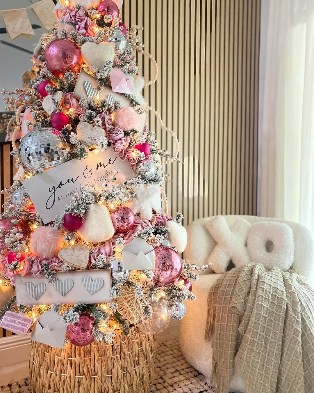 A playful small tree set in a basket base, styled with hot pink baubles, faux fur puffs, mini envelopes, and tiny disco balls. It’s flirty and fun. Keep the ornaments tight to the body of the tree so it looks like a candy apple. Use pearl strands and pale garland to soften the shine. The basket adds texture and raises the height without a bulky stand.
