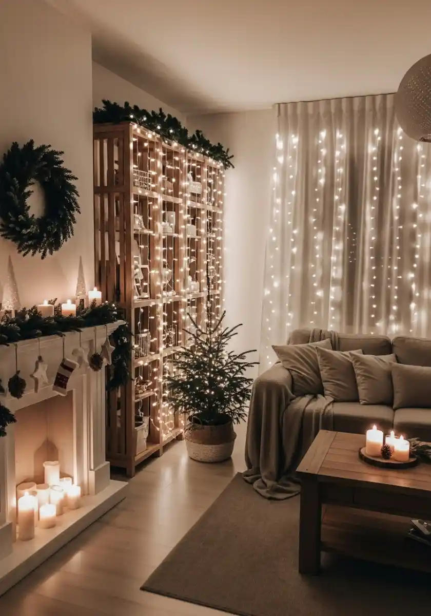 I’m a sucker for soft golden lights. In this look, shelves and curtains share the spotlight. A tall bookcase wears icicle strands like jewelry while a sheer curtain becomes a glowing backdrop. Put the plug on the side with the lowest traffic so you don’t trip. I slide clear hooks along the top of my curtain rod and let strands hang in different lengths. The result feels like snowfall. Candles in the fireplace opening mirror that glow. If you can’t burn real ones, use good faux candles and tuck a few pine sprigs around the bases.