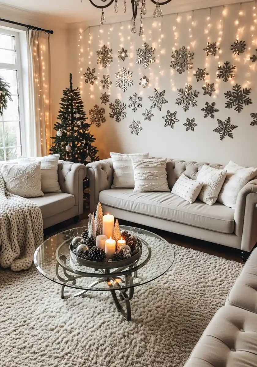 It’s minimal but not bare. Add pinecones and let one ornament hang lower than the rest for a playful note. This corner works in small apartments where you still want strong Christmas wall decor for living room but can’t fit a giant tree. Pair with a neutral wall so the flakes pop. Search phrases like “living room wall Christmas decor snowflakes,” and “holiday living room wall decor with lantern.”