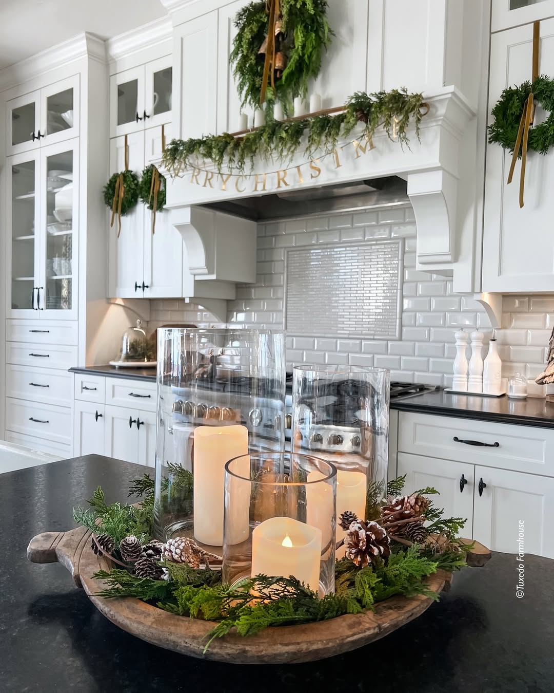 White cabinets, subway tile, and that crisp hood make the greenery pop. A cedar swag with a soft “Merry Christmas” banner drapes across the mantle-style hood, and petite wreaths dangle from the glass doors on velvet ribbon. On the island, a carved dough bowl holds three glass cylinders with flicker candles surrounded by cedar and frosted pinecones. It’s calm. Like, breathe here calm. I always get nervous decorating near the stove, but this setup stays away from flames and still reads festive.