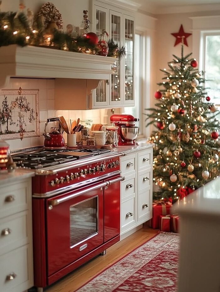 The red range here is a showstopper, like Santa decided to cook pasta. It’s paired with white cabinets, glass doors, and a tree tucked near the window so the lights reflect in the backsplash. A short garland rides the range hood with a few ornaments tucked in, and the runner pulls everything together with pattern and warmth. Honestly, I didn’t think a full tree would work in a kitchen until I saw this. Now I want to scoot my trash can and try it.