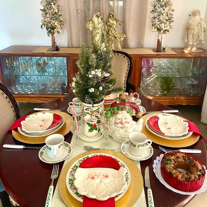I am not usually a “character plates” person, but these Santa plates changed my mind. They sit on gold chargers with red napkins tucked under the beards, which is adorable and also clever. The centerpiece is a small potted tree in a striped mug, surrounded by candy-cane filled glasses and a vintage Santa pitcher. In the back, tall angels and snow-kissed trees bring a soft glow. It feels like Grandma’s dining room but fresh.