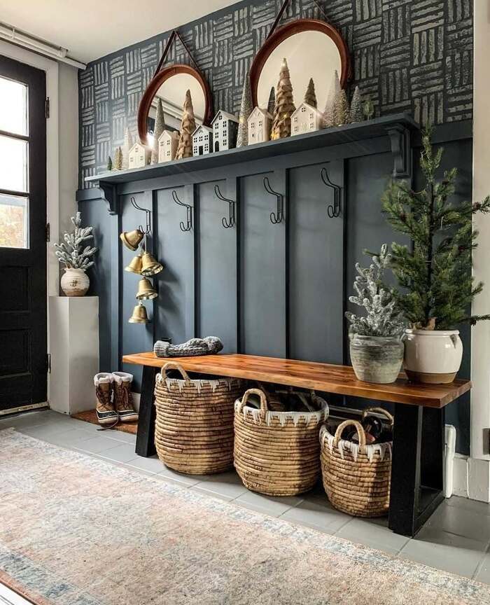 Mudrooms are usually the land of boots and mittens, but this one found joy. Deep charcoal paneling hosts a narrow shelf with two round mirrors. On top sits a ceramic village with bottle-brush trees, and a cluster of brass bells hangs from a hook. The bench is warm wood and the baskets actually swallow the clutter. I stared at this and thought, this is how winter should feel when you come home.