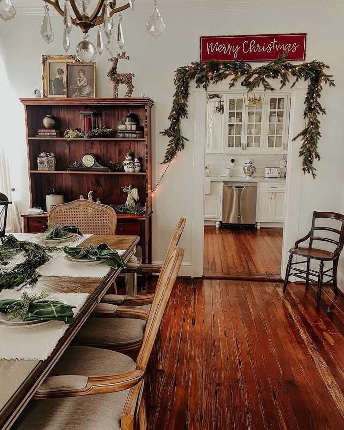 This dining room feels storied. There is a Merry Christmas sign above the door, and a swooping garland frames the opening into a bright kitchen beyond. The vintage hutch shows off collected pieces with a small nativity and a straw reindeer on top. The table has simple linen runners crossed with a line of greens and place settings that feel relaxed. Floors are warm wood, so everything glows.