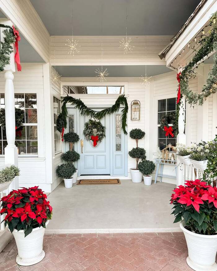 The porch gives instant joy before you even open the door. Poinsettias flank the entry in white pots. A garland swag drapes across the top of the doorway, and a round wreath with a red bow sits on the soft blue door. Hanging starburst lights float overhead like tiny fireworks. Window wreaths tie to red bows, and topiaries keep the look neat. I’m a porch sitter, so this one had me planning cocoa outside, even if it’s cold.