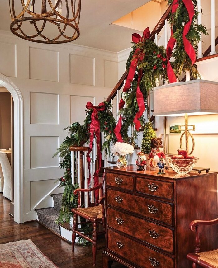 This entry feels like a hug from your favorite aunt. Fresh greens fall thick down the railing, and oversized red velvet bows sit at each post. The sheen of the satin against the paneled walls and the warm wood chest is just right. I’m partial because my grandmother had a chest like this, and we lined it with cards every December. The nutcracker trio on top is whimsy, not clutter. It’s classic Christmas decorations done with heart.