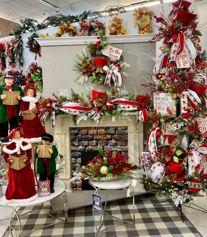 I stumbled on this display and had to stop scrolling. It’s a workshop wall packed with wreaths, swags, and mantel pieces built from red poinsettias, frosted greenery, striped ribbon, and even top hats. Yes, top hats. The secret isn’t more, it’s structure. Each piece has a strong focal like a hat, a big bow, or a sign, and then the filler sprays radiate around it. That’s why it looks professional, not messy.