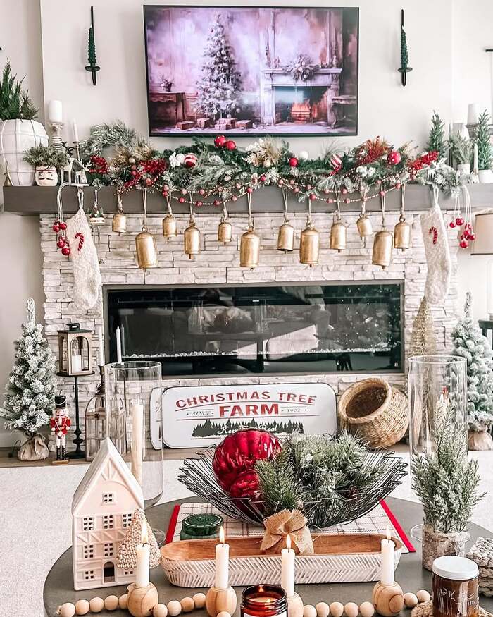 This room feels like a storybook. A chunky mantel covered in frosted greens, red berries, and striped ornaments. A line of brass cowbells dangles beneath, and stockings hang off the ends. On the coffee table there’s a Christmas Tree Farm sign, a wood bead strand, and tiny houses. It’s cheerful and family friendly. The bells are the hero though. They add movement and that vintage sound if anyone nudges them.