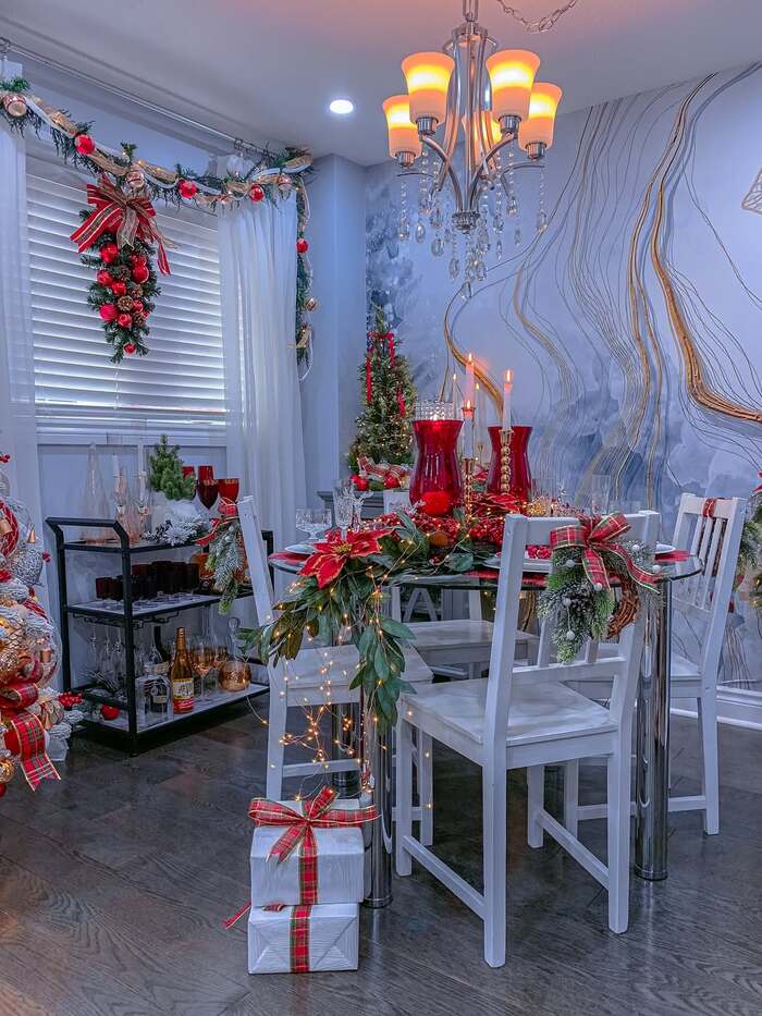 This cozy space proves you don’t need a huge room for big holiday energy. A plaid runner anchors the glass table, poinsettias trail down the center, and a string of fairy lights zigzags through the greens. The curtain rod wears a garland with matching bows and red ornaments. There’s even a tiny bar cart twinkling in the corner. It feels party ready but you can still eat dinner without moving an entire forest.