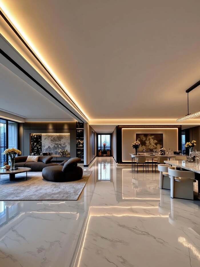 What I love here is how the designer uses lighting to separate zones without walls. Warm LED strips run along the ceiling edges and around the art panels behind the sofas and the dining area. The glow around each zone makes your brain say “this is the lounge” and “this is where we eat” even though there is no physical divider. If you want a luxurious living dining combo, steal this trick. Keep your floor consistent, then use rugs and lighting to mark each part. It is way cheaper than building new walls and looks more modern too.