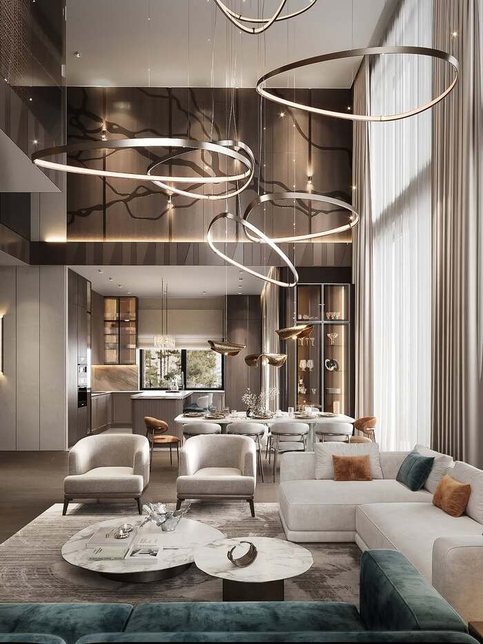 The second idea is pure drama. The ceiling is crazy tall, and floating from it are these huge metal rings of light, hanging at different heights. Under them, the combined living and dining room stretches from a cozy L shaped sofa in cream and teal, to a big dining table with soft upholstered chairs, and finally to a sleek kitchen at the very back.