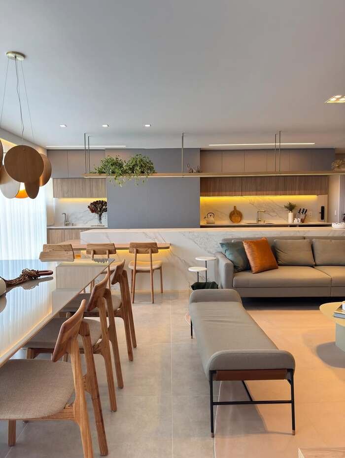 The smart move here is the use of color flow. The same wood tone appears in the chairs, the lower cabinets, and a few decor pieces. The same pale grey shows up on the sofa, bench, and kitchen wall. A strip of yellow lighting under the upper cabinets adds a cozy glow that pulls your eye across the room, making the whole living dining combo feel like one story instead of two scenes stuck together. If you want a relaxed, modern open concept space, this is a great example. Pick one wood tone, one main neutral, and repeat them without getting bored. It really works.