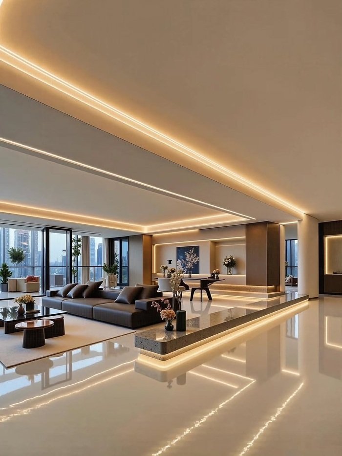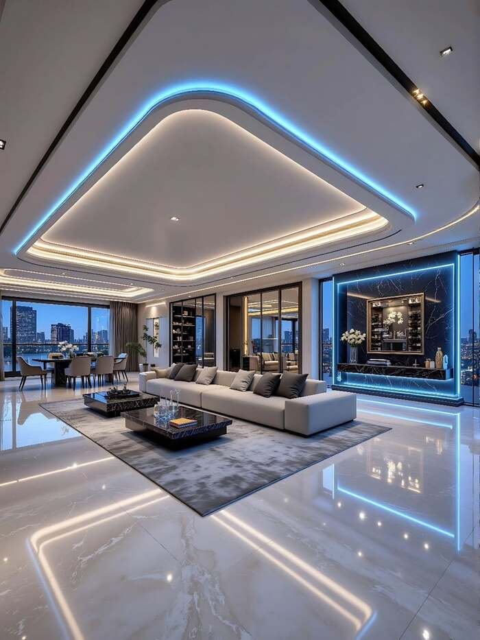 Idea four is for people who secretly wish they lived inside a sci fi movie. The ceiling of this combined living and dining room has curved coves of light, some warm, some electric blue. That blue line continues on the wall behind a glossy bar cabinet, so the room feels like it belongs high above a city, which it actually does.