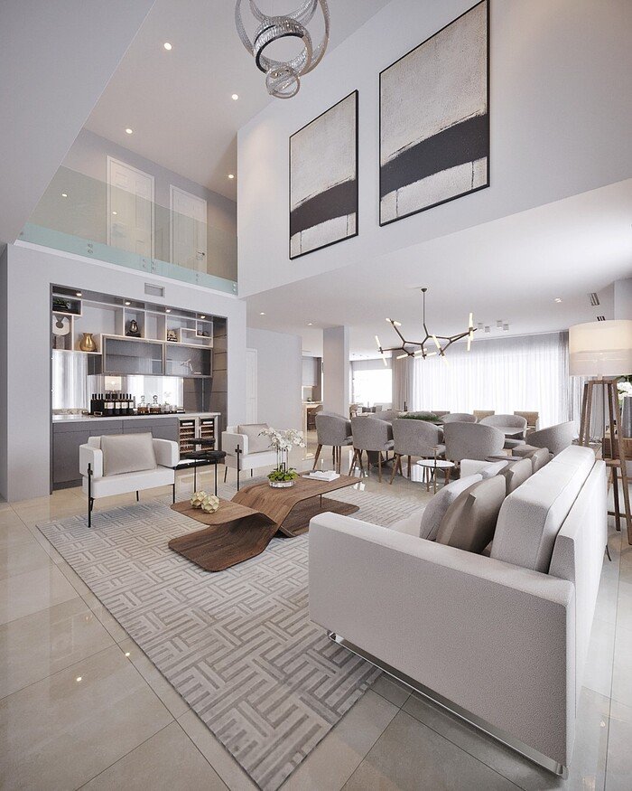 The fifth space is a very airy combined living and dining room with double height ceilings. Everything feels light. There is a pale grey sofa, white armchairs, and a large patterned rug grounding the lounge area. Behind that, a generous dining table is wrapped in grey upholstered chairs. At the far end, built in shelves and a mini bar bring in darker tones so the room does not feel washed out.