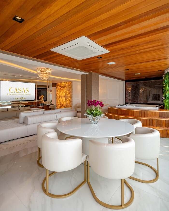 Idea six is honestly a little wild but in a good way. The ceiling is warm wood, the floor is glossy white, and tucked right behind the dining set there is a hot tub. Yes, a hot tub in the same combined living and dining room. In front, a round white table with plush barrel chairs sits on thin gold bases. Behind that is a white sofa, and even more gold and crystal lighting.