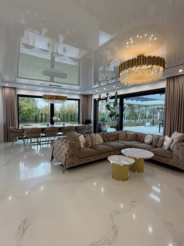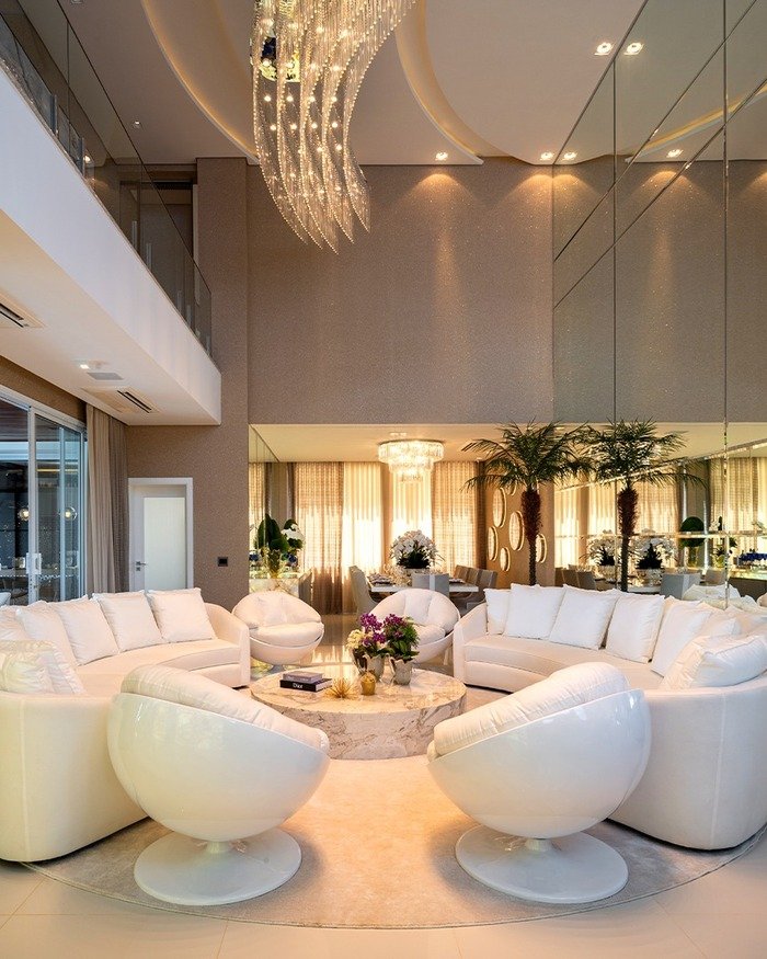 The last room in this batch is wild in the best way. The living area is basically a white conversation pit made of curving sofas and rounded swivel chairs, all grouped tightly around a marble coffee table. Right behind it you can see the dining table shining under its own chandelier. The mirrored wall doubles everything, so this combined living and dining room feels twice as big and twice as bright.