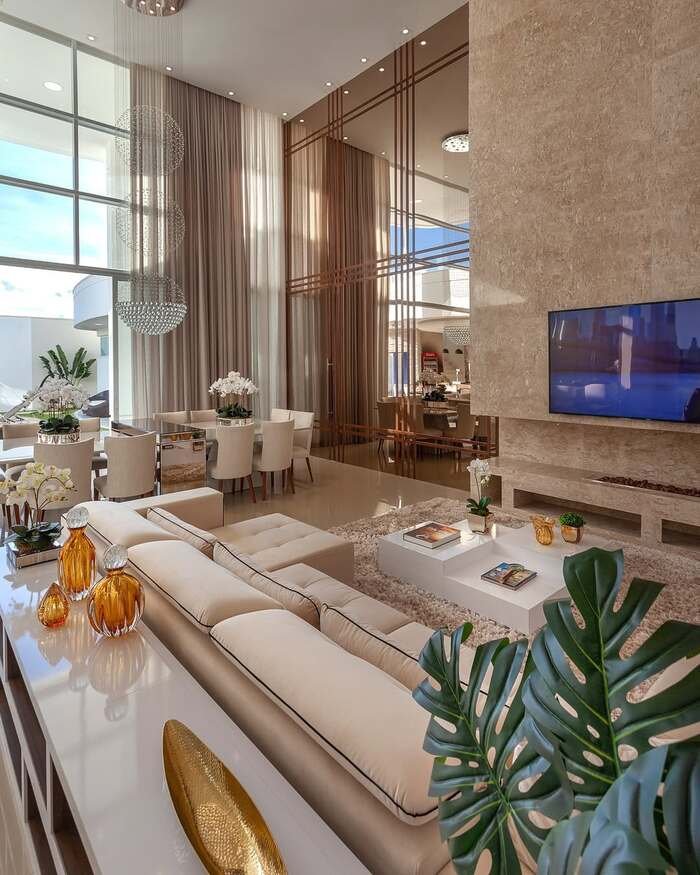 What makes this open plan living and dining space so powerful is the direction of everything. The sofa, the ceiling lights, and the floor tiles all follow the long line of the windows, leading your eye straight to the view. The color palette stays soft, mostly beige, white, and gold, which lets the city outside supply the drama. Even if your view is just the neighbors backyard, you can still borrow this idea. Arrange your living dining combo so the sofa and dining table both face the window, keep your colors gentle, and use one long light fixture to pull the areas together.