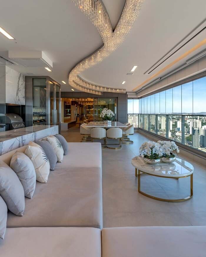The last space is a dream. Imagine a combined living and dining room running along a wall of glass that looks out over an entire city. On one side, a long pale sectional sofa sits against a marble counter. On the other side, a round dining table with soft white chairs and gold bases sits under a wavy crystal chandelier that snakes down the ceiling like a river of light.