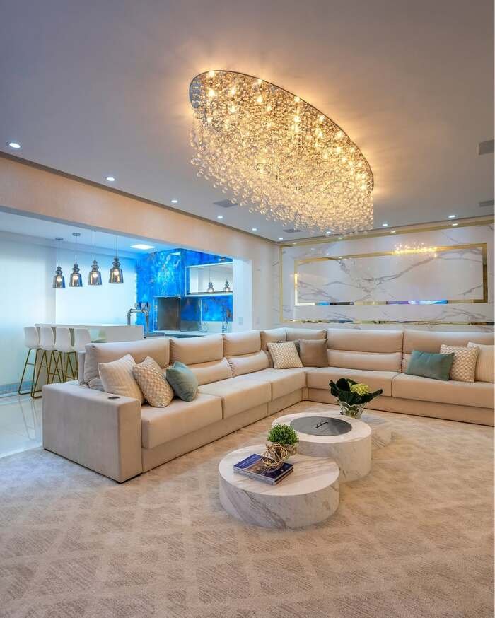 This space feels like a movie set someone forgot to take down. The huge U shaped sofa wraps around the room, so the whole combined living and dining room feels like one giant hangout spot. What really grabs my eyes is the bright blue kitchen wall in the back. It’s almost like an aquarium, which sounds weird, but somehow works with all the creamy beige furniture and marble coffee tables. The giant chandelier above the sofa throws tiny sparkles over everything, so the room feels festive even if you are just eating noodles on the couch.