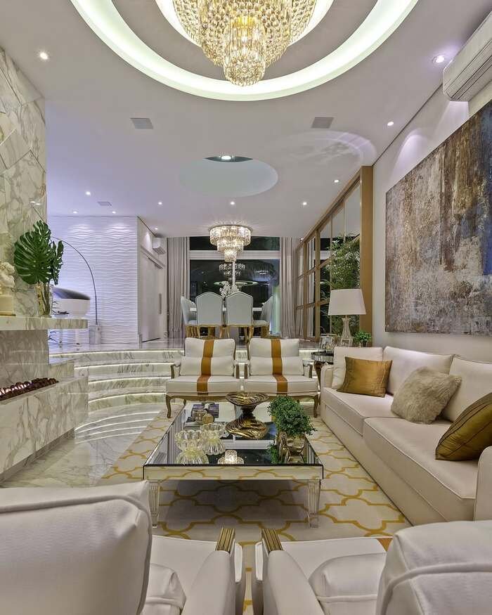 This room is like a glamorous hotel lobby that decided to become a house. There is a clear combined living and dining room layout here, but the levels make it playful. The living area sits on a slightly lower marble floor with curved steps and a patterned rug. Above it, at the back, a formal dining table waits under a matching chandelier. The white armchairs, sofa, and gold striped accents make everything feel polished and a little bit royal.