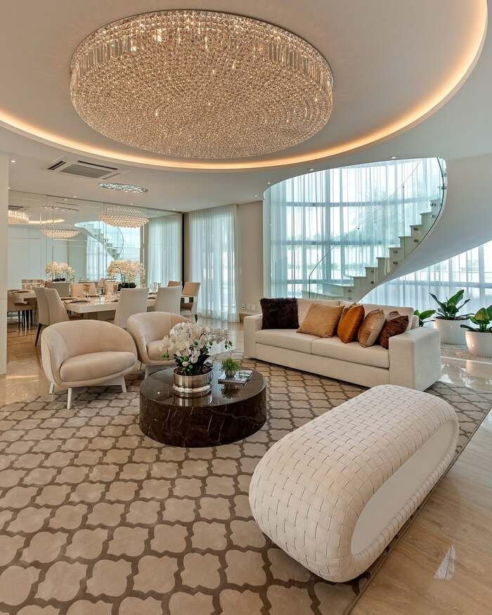 I like how everything here is gently rounded. Chairs, bench, stair, even the edge of the rug. Those curves naturally guide your eye from the lounge area to the dining area. The colors are warm but quiet, mostly creams, light browns, and a little bronze. If you have a combined living dining room and want it to feel more relaxed and glamorous at the same time, try this trick. Choose furniture with rounded corners, add a big circular light or round rug, and let your table and sofa share similar soft tones. It’s really hard for a room to feel harsh when all the shapes are this friendly.