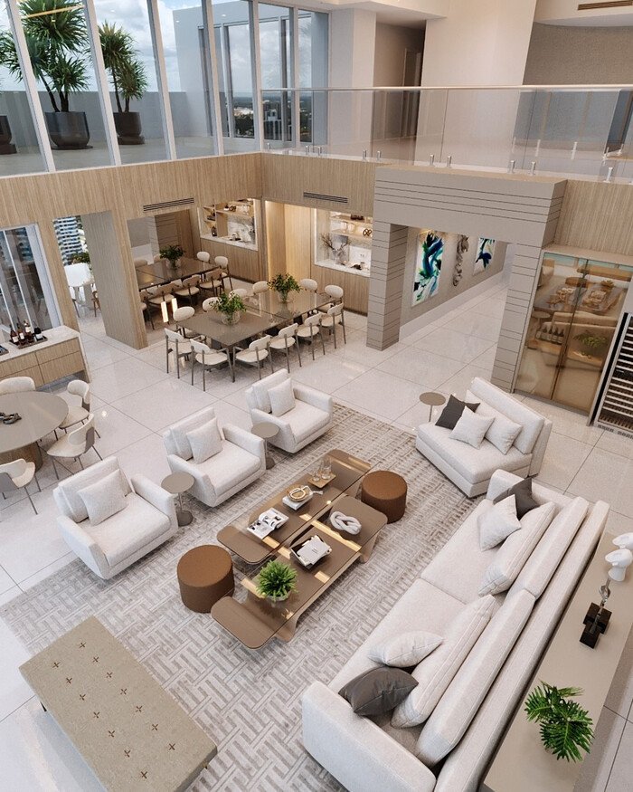 Here we get a mega sized example of a combined living and dining room, the kind that probably belongs to a penthouse owner who never has to count grocery money. The main living area is in the center with two big sofas facing each other, armchairs, and layered coffee tables. Around the edges you can see not just one but two dining zones, plus a bar station. Each area has its own table type, but the colors and materials match, so everything feels related.