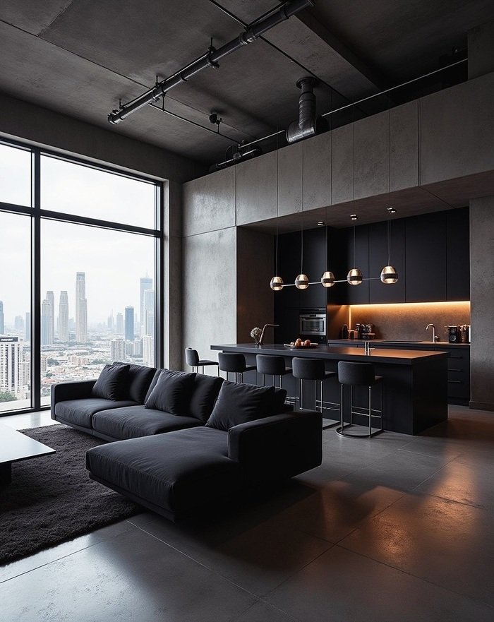 Now for a totally different mood. This apartment is like the lair of a tech founder who never sleeps. Dark walls, dark sofa, black kitchen. But it is still a combined living and dining room, because the kitchen island is clearly working as the dining zone. Bar stools line up on one side, while a deep charcoal sofa anchors the living area in front of that crazy-good city view.