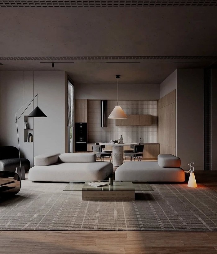 This next design is a lesson in low furniture. The combined living and dining room uses two low, almost mattress-like sofas in soft grey fabric. They sit on a large rug with a subtle grid pattern, and everything feels calm and close to the ground. At the back, the dining area is simple: a round table, slim chairs, and a cone-shaped pendant. Wood cabinets and panels add warmth behind them.