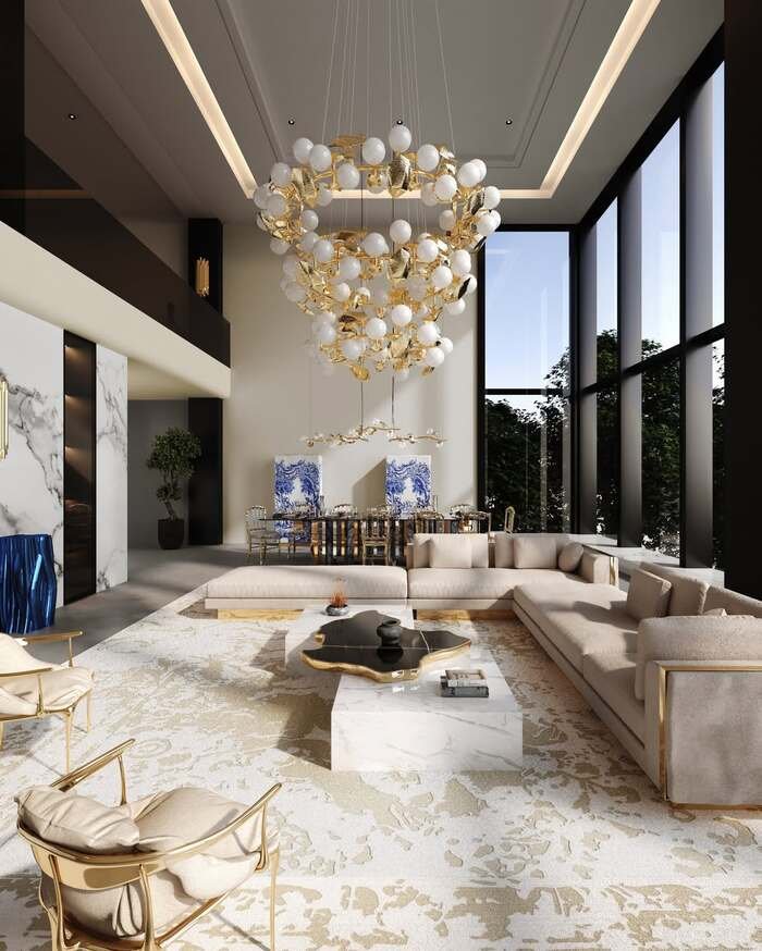 What makes this living and dining combo work is repetition. Gold shows up everywhere: in the chandelier, chair legs, table base, and even the trim around the marble walls. But the upholstery stays mostly neutral, so the bright metal doesn’t feel trashy. This creates an open plan living dining zone that is dramatic but still kind of soft, almost like a fancy hotel lobby.
