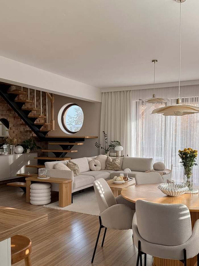 This cozy space made me feel hungry for brunch as soon as I saw it. It’s a combined living and dining room filled with sunlight, pale wood, and soft fabrics. The circular window near the staircase is a little piece of magic, almost like a porthole, and the light flows across the sectional sofa and round dining table. Everything is warm but gentle: beige, cream, light oak.
