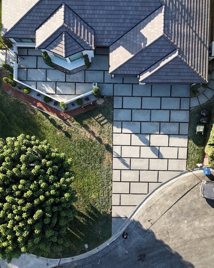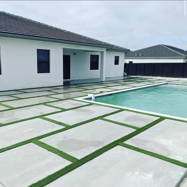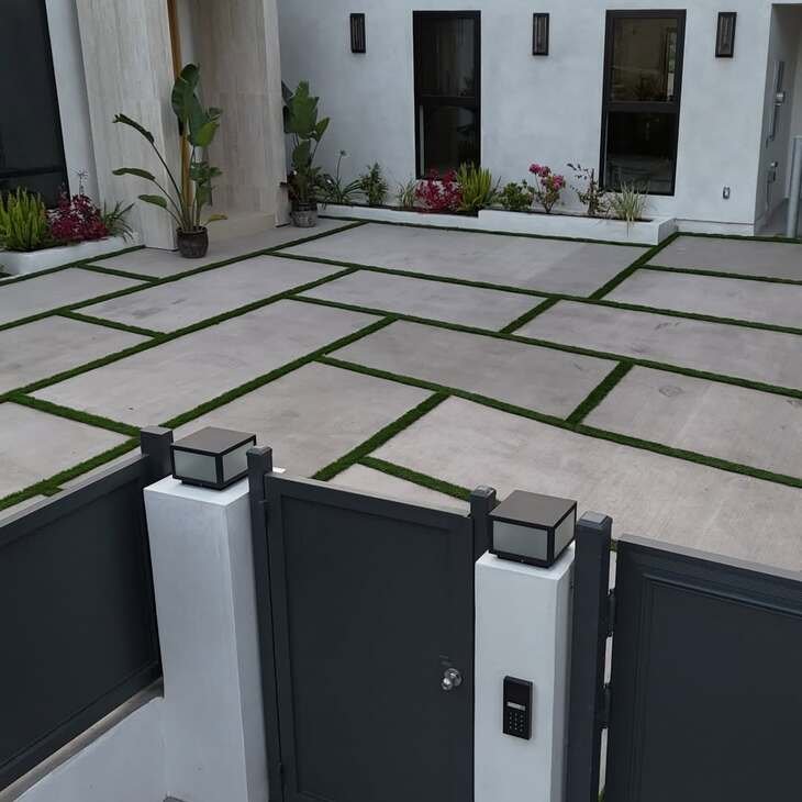 In the second image, we see a layout where the concrete squares almost look like a puzzle, perfectly placed with precise lines separating them. The balance between concrete and greenery—such as low grass or creeping vines—is spot-on. It doesn’t only create a stunning visual appeal, but it also has a functional purpose: the grass patches help break up the harshness of the concrete, softening the entire look.
