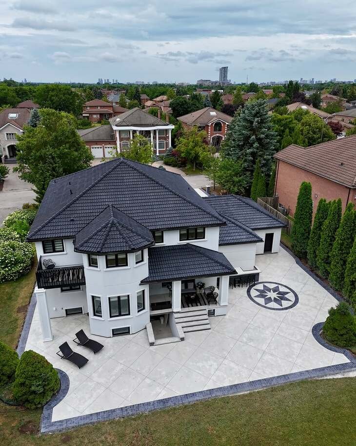 If you're looking for an extravagant concrete patio idea front of house, this grand, spacious patio shown in the sixth image is where luxury meets outdoor living. The sheer scale of this front yard patio is impressive, but it’s the detailing that makes it work. The subtle inclusion of a patterned circular design on the ground adds an extra touch of sophistication without overshadowing the simplicity of the concrete.