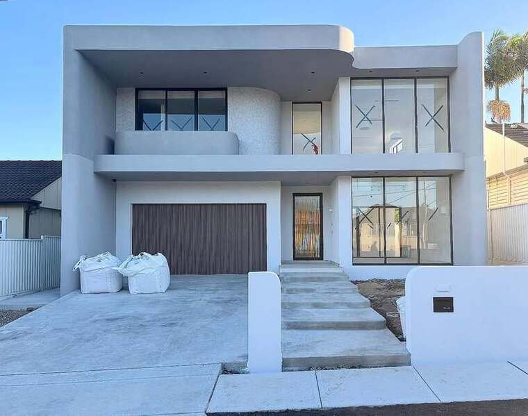 What makes this concrete patio idea front of house especially unique is its use of material contrasts. The concrete here is paired with the sleek, wood-textured garage door. That visual contrast highlights the modern feel of the design while also introducing a natural element to soften the hard edges. If you're going for a contemporary aesthetic with a minimalist touch, this is the way to do it. You can add additional landscaping, like potted plants or low hedges along the edges, to further enhance the contrast between the bold concrete and the soft greenery.