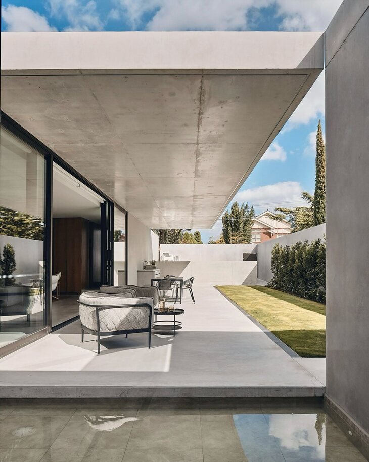 I have to admit, I’m a sucker for modern, minimalist designs. And when I came across this particular concrete patio idea front of house, I couldn’t help but feel completely captivated. Just look at this house! The sharp, clean lines of the concrete patio seamlessly blend with the minimalist structure of the home, creating a look that feels both futuristic and grounded at the same time.