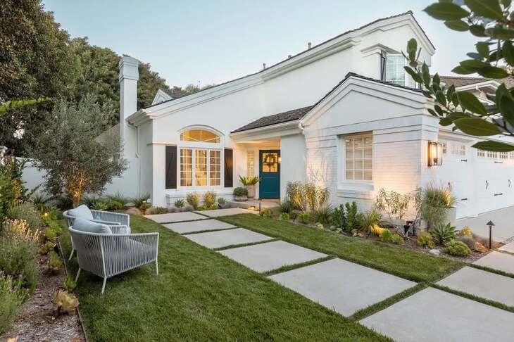 The next step in creating a stylish front patio is to think of it as the welcome mat for your home. It’s not just about the surface; it’s about how you use the space to complement your house's style. Take a look at the first photo I found. It shows a stunning patio area in front of a neutral-colored house with a modern vibe. Notice how the design is kept simple yet elegant? A few concrete slabs spaced apart with some greenery in between brings an organic feel to an otherwise structured space.