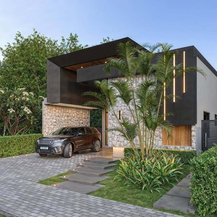 Let’s start with the showstopper – a modern, geometric concrete patio that instantly turns your front yard into a stylish masterpiece. If you're like me and love clean lines, this is such an exciting option. This design involves creating a grid pattern with concrete slabs, but instead of just placing them side by side like a traditional patio, you create a visual pattern by alternating different shapes or adding contrasting elements like grass or pebbles in between.