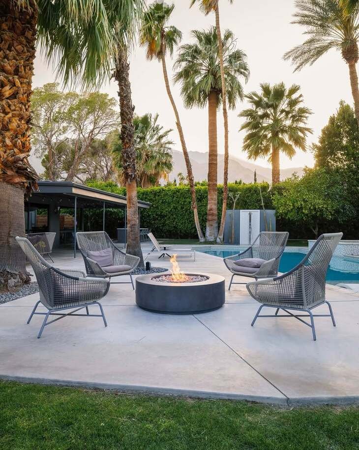 There’s something kind of magical about a simple round fire pit set right beside a swimming pool, especially when it’s framed by tall palm trees like in this design. The smooth concrete patio keeps everything clean and laid back, while the modern woven chairs make the whole setup feel like a mix between a resort and your best friend’s backyard. Even though it’s not a complicated design, it hits that sweet spot where you just want to sit down, kick your shoes off, and forget about your phone for a while.