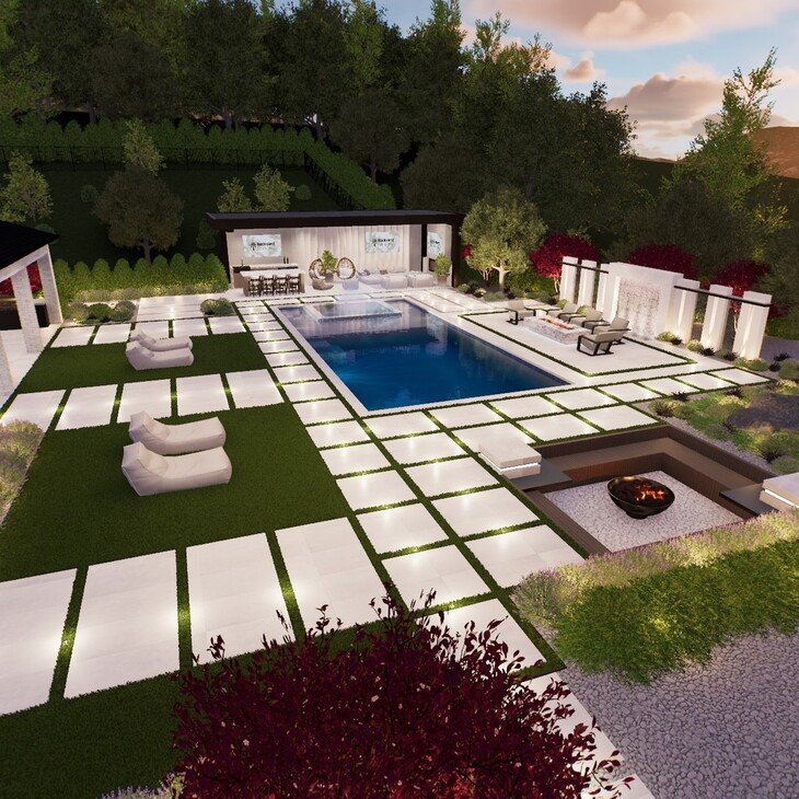 This next design looks like it came straight out of a dream house video that I’d probably watch ten times. The entire backyard is basically a glowing checkerboard of giant concrete pads separated by turf, and at night the LED lighting around each square makes it feel futuristic without being cold. Then tucked into one corner is a sunken fire pit lounge, giving you a cozy place to land after wandering through all that open space.