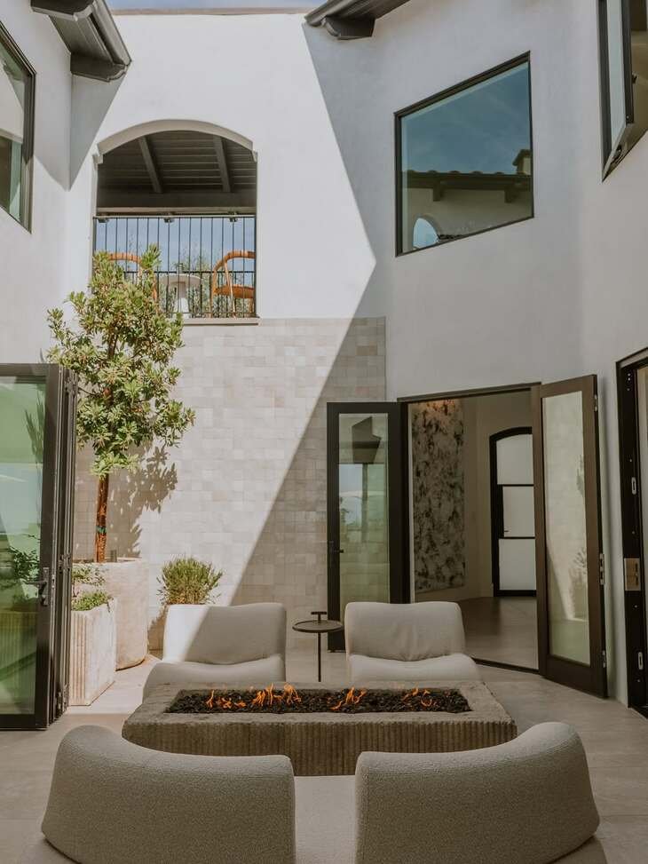 The only thing I’d consider is airflow. Courtyards hold heat, and with solid walls on all sides, smoke or warmth can collect quickly. A gas fire pit helps with that because it burns cleaner, but adding a small fan or leaving one of the doors cracked might make the space even more comfortable. Still, this is one of those rare setups that feels both polished and super personal, like a private escape right inside your home.